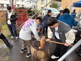 毎年恒例となった餅つきを12月14日に開催しました。小雨が降りしきる中